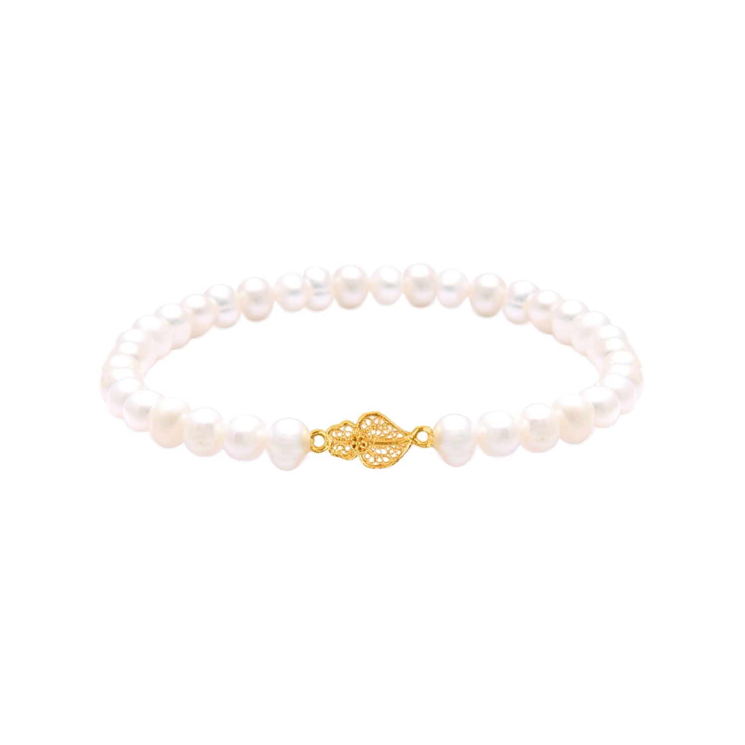 Pulsera Corazón de Viana en filigrana con perlas, realizada en oro de 19,2Kt, es una selección de joyería tradicional portuguesa. El oro portugués se encuentra entre los más puros del mundo y está certificado por la Casa de la Moneda portuguesa, Casa da Moeda.